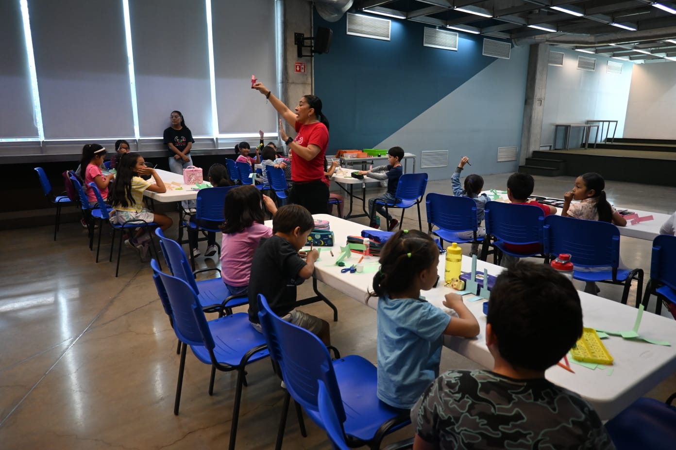🛠️ Durante el taller, los niños de 6 a 8 años construyeron diferentes helicópteros de papel de distintos tamaños, explorando cómo el tamaño y el peso afectan el vuelo. Experimentaron agregando un clip para dar peso al prototipo y descubrieron las diferencias al lanzarlos, observando cuál volaba más lento o cuál giraba más.